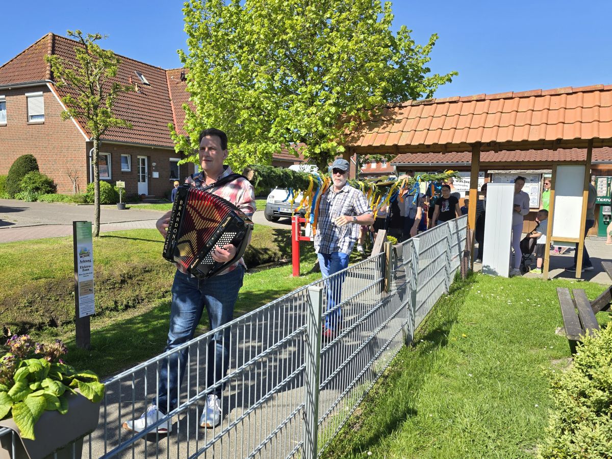 Im Haustierpark Werdum wird mit Musik der Maibaum aufgestellt.