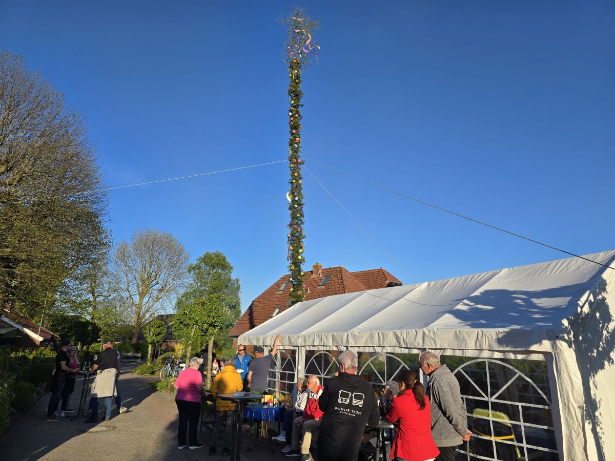 Die Straßengemeinschaft „Pudding“ stellt den Maibaum auf.